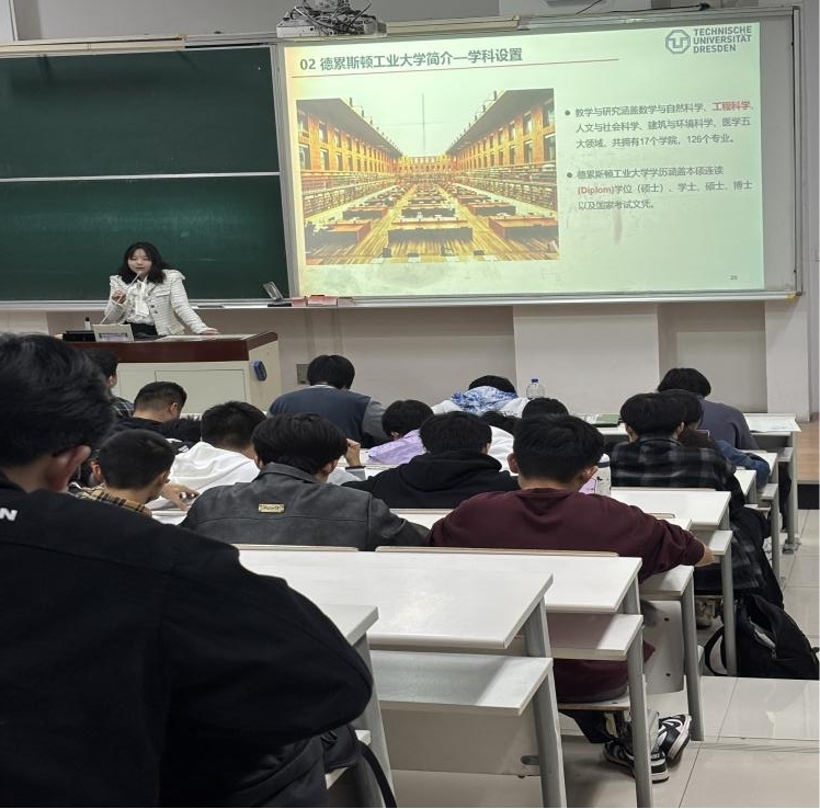 讲座伊始,德累斯顿工业大学招生代表赵老师首先介绍了德累斯顿工业大学(TUD)的办学历史及规模,是德国著名理工类大学联盟(TU9)成员,也是欧洲航空航天大学合作联盟(PEGASUS)德国五所高校之一。随后,赵老师详细讲解了合作项目的具体形式,包括2+2本科双学位项目、4+X本硕连读项目等模式,并重点分析了项目对学生学术提升和职业发展的双重价值。在内容介绍环节,赵老师还强调了德国留学概况及优势、德累斯顿工业大学的专业实力与特色、产业联系、学科设置,德累斯顿的学习和生活、学分转换、奖学金申请及生活成本等实际问题。同时,讲座还特别提醒学生关注语言要求、文化适应及签证办理等关键事项,确保项目顺利推进。