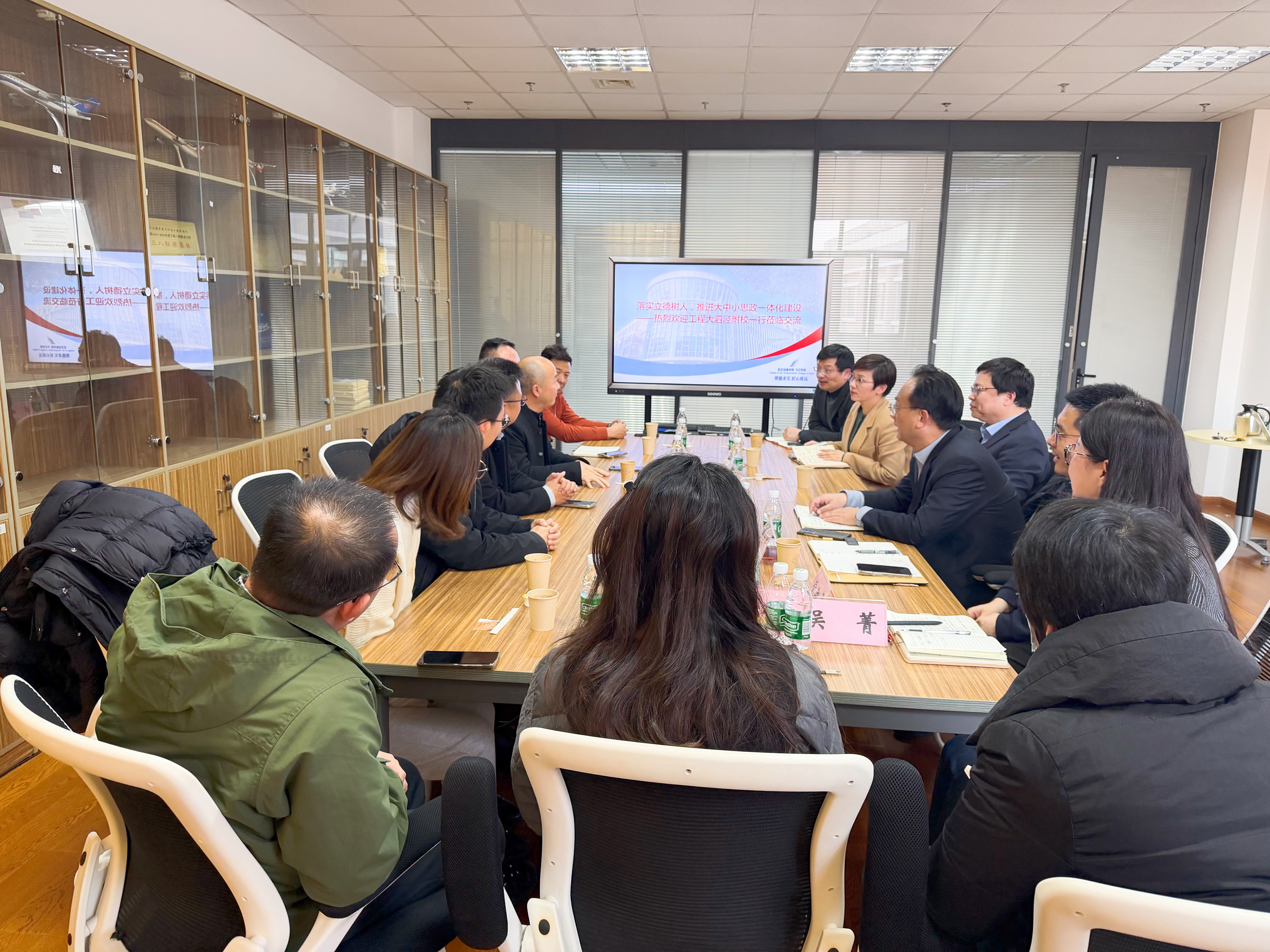 为贯彻落实立德树人根本任务,推进大中小学思想政治教育一体化建设,1月13日下午,工程大泗泾附校校长季国栋、党委书记高叶一行来校开展交流座谈。学校副校长夏春明出席会议,航空运输学院党委书记周慧艳,学院党委副书记、院长李程,学校教务处副处长唐永升,学院党委副书记戴振华、副院长党淑雯、工会主席吴菁、创新实验室负责人李永平、学工组组长陈丹凝参加会议。