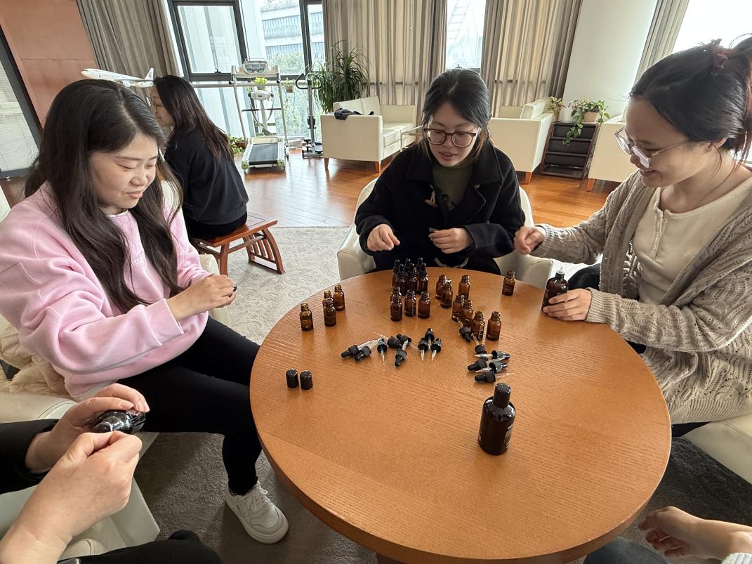 活动特邀专业芳香疗法师庞乐君担任主讲,聚焦高校女教师职业特性,将植物精油科学机理与情绪管理相结合。在知识讲解环节,老师们系统了解了精油的萃取工艺及不同香型对神经系统的调节作用——薰衣草助眠安神、迷迭香提神醒脑、柑橘类提振情绪,这些恰好回应了日常备课、科研攻坚中的压力纾解需求。